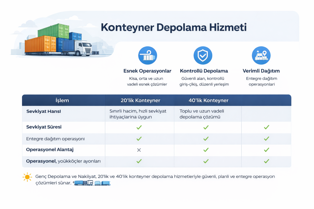 Yüksek hacimli yüklerinizi sadece bir alanda bekletmiyor; sevkiyat ve dağıtım süreçlerinizle tam entegre, yaşayan bir lojistik merkez kurguluyoruz. Genç Depolama ve Nakliyat olarak konteyner depolamayı, küresel ve yerel tedarik zincirinizin kesintisiz devam etmesini sağlayan stratejik bir istasyon olarak ele alıyoruz.